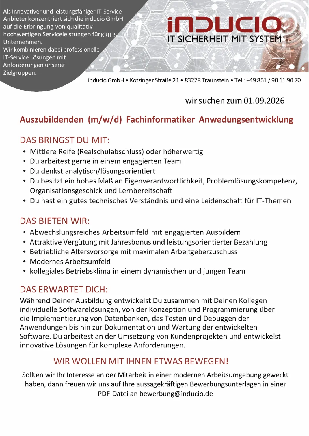Unsere moderne Arbeitsumgebung sowie die strukturierte Ausbildung unterstützen deine fachliche und persönliche Entwicklung optimal. Damit legst du den Grundstein für eine erfolgreiche Karriere im Bereich der IT-Systemintegration.